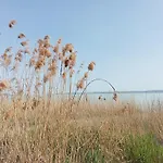 Die 1-Zimmer-Villa Apartment Vadrozsa, Privatgarten Mit Seeblick Balatonakali verfügt über ein privater Autoparkplatz und eine Terrasse mit Aussicht auf den See.